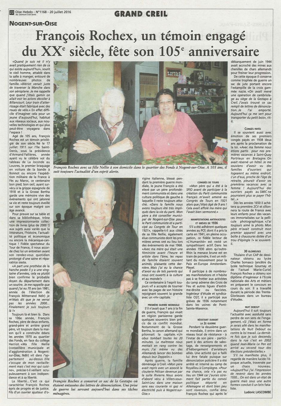 À l’occasion de ses 105 ans Oise-Hebdo avait consacré un grand article à François Rochex dans