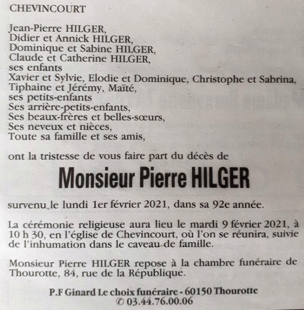 L’ANACR Oise vient d’apprendre le décès de Pierre Hilger qui s’était engagé dans la Résistance à l’âge de 15 ans. Jeune Résistant il agit aux côtés de son père Norbert Hilger dans les FTPF Oise secteur de Compiègne.