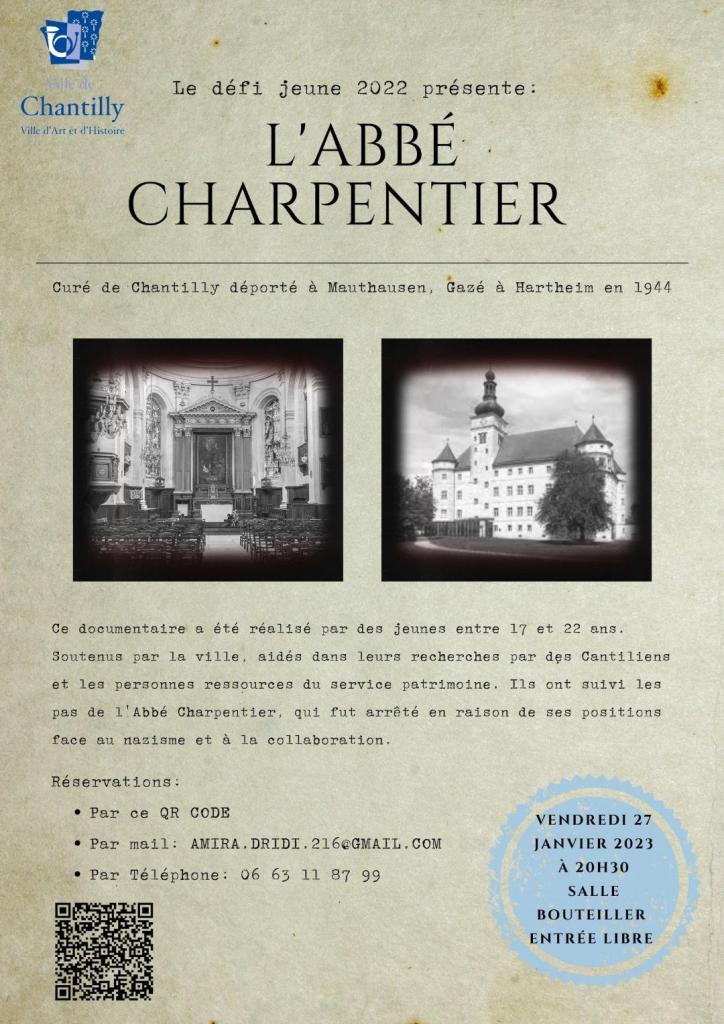 Le premier exemple nous vient de Chantilly, avec un film proposé le 27 janvier : à 20h30 dans la salle Bouteiller sera présenté un documentaire réalisé par des jeunes cantiliens (âgés de plus de 17 ans jusque 25 ans) dans le cadre du « Défi Jeunes 2022 » organisé par la ville : accompagnés de réalisateurs professionnels, ils sont allés sur les pas de l’abbé Charpentier. Ce prêtre de Chantilly a été arrêté le 23 janvier 1944 au cours d’une rafle ; interné d’abord à la prison de Compiègne puis dans le camp de Royallieu, il a été déporté à Mauthausen près de Linz en Autriche par le convoi parti de Compiègne le 22 mars 1944 . Il est gazé le 7 août 1944 à Hartheim (un château, situé à 27 km à l’ouest de Linz, qui a été le centre d’extermination par gaz du camp de Mauthausen).