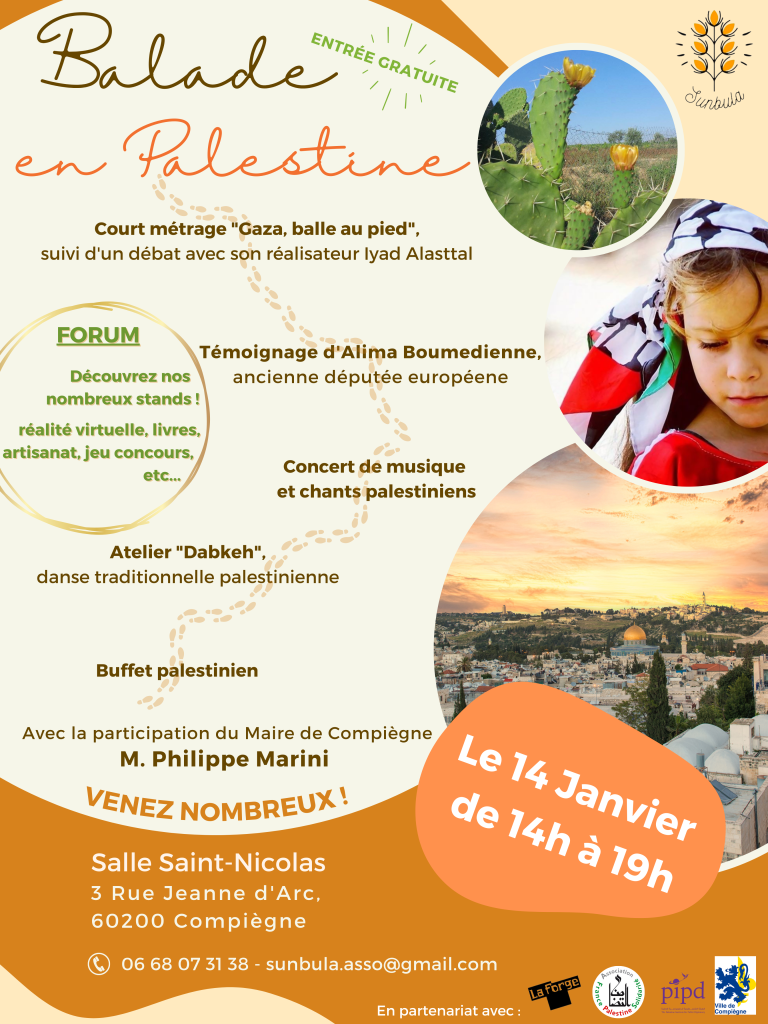 A l’occasion de son 2ème anniversaire, l’association Sunbula vous invite à partager un moment solidaire et culturel intitulé « Balade en Palestine » pour « découvrir la Palestine par la porte culturelle » et « vivre et transmettre l’énergie du peuple palestinien ». Un double objectif entre culture et combat politique qui est partagé par l’ANACR-Oise (comme l’ANACR Nationale) qui soutient la cause palestinienne, pour le respect des accords signés et pour le respect de la vie du Peuple Palestinien.