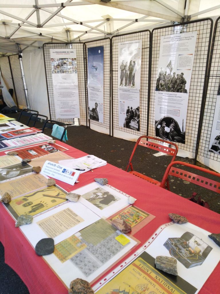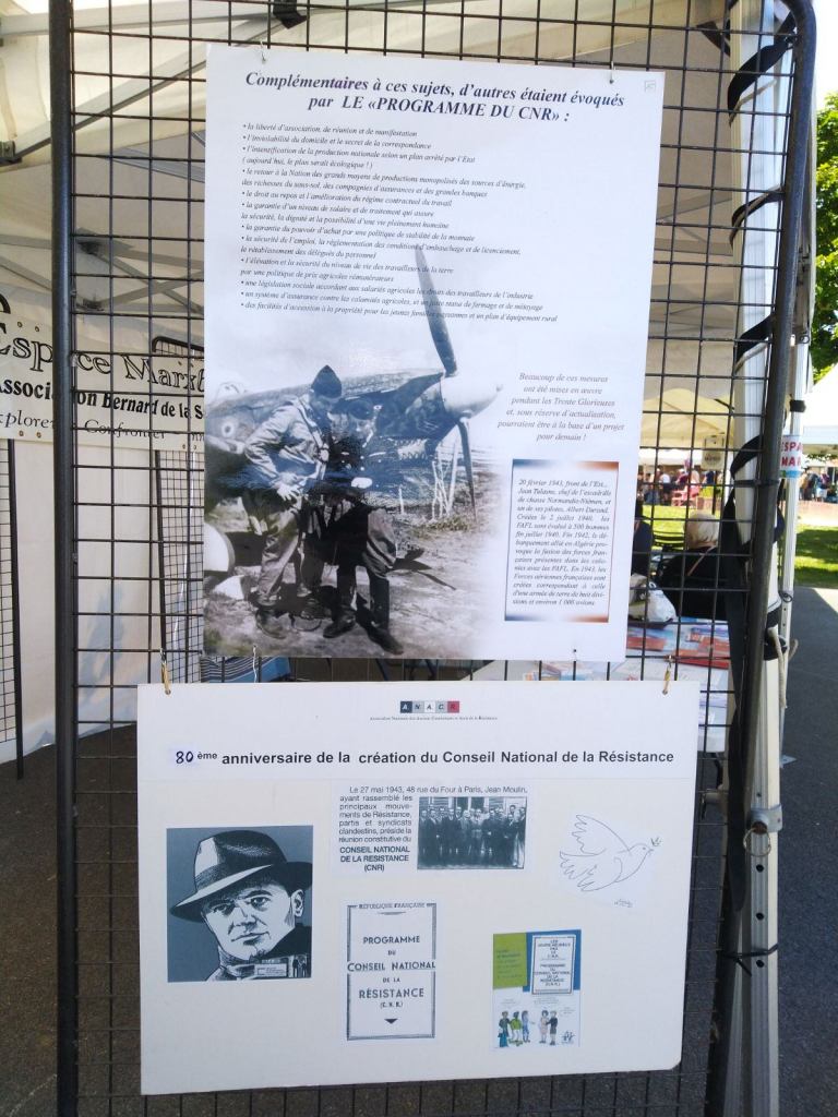 Au cours de cette fête de nombreuses associations avaient installé un stand, dont l’ANACR-Oise avec son exposition sur le Conseil National de la Résistance (CNR) qui a été bien fréquentée. Rappelons que le 27 mai 2023, donc la veille de la Fête de la Paix, était le 80ème anniversaire de la création du CNR adopté à l’unanimité ainsi que son programme édité le 15 mars 1944, lui aussi adopté à l’unanimité.