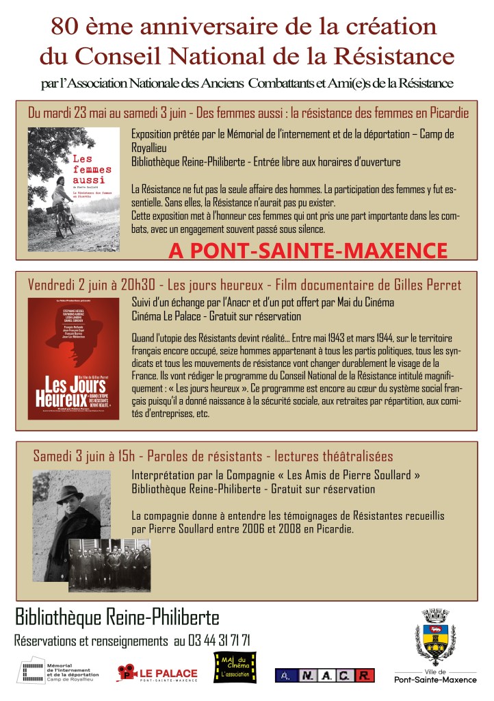 D’abord un rappel : à Pont-Sainte-Maxence, vendredi 2 et samedi 3 juin on célèbre aussi la création du Conseil National de la Résistance ! Et l’exposition Les femmes aussi est déjà visible à la bibliothèque Reine-Philiberte.