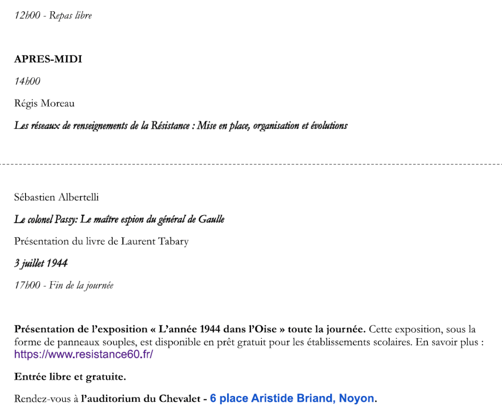 Du 6 au 31 mars à Ribécourt-Dreslincourt, à la médiathèque Roland Florian, deux expositions « Les femmes aussi, la Résistance des femmes en Picardie » et « Le Conseil National de la Résistance et son programme Les jours heureux » ; toujours à Ribécourt-Dreslincourt, le vendredi 8 mars, la lecture théâtralisée « Les femmes aussi » et le samedi 16 mars, une conférence-débat « Création du Conseil National de la Résistance et ses grands principes »