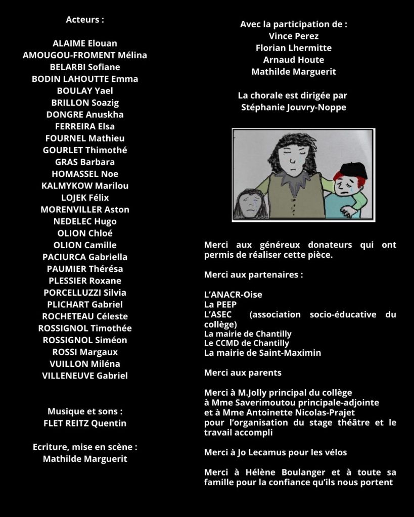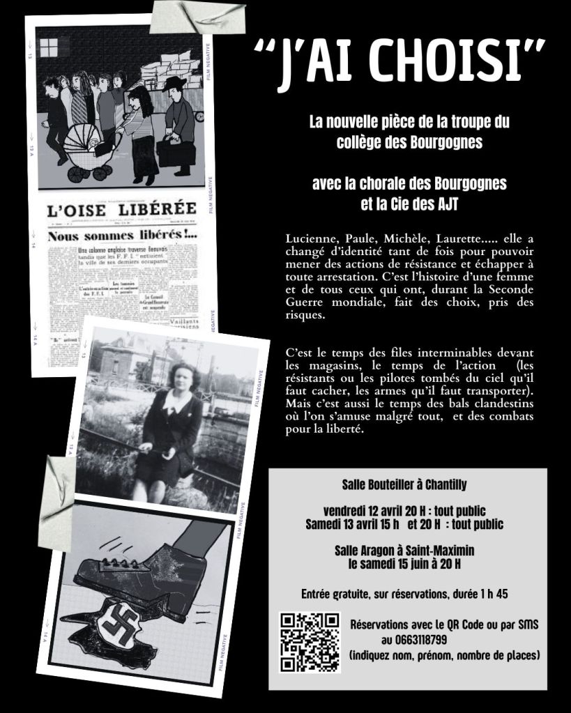 Les 12, 13 avril à Chantilly et le 15 juin à Saint-Maximin, « J’ai choisi » par la troupe de théâtre du collège des Bourgognes ; une pièce écrite et mise en scène par Mathilde Marguerit-Houte, professeur d’histoire-géographie au collège des Bourgognes, qui s’est inspirée des souvenirs rédigés par Lucienne Fabre-Sébart.