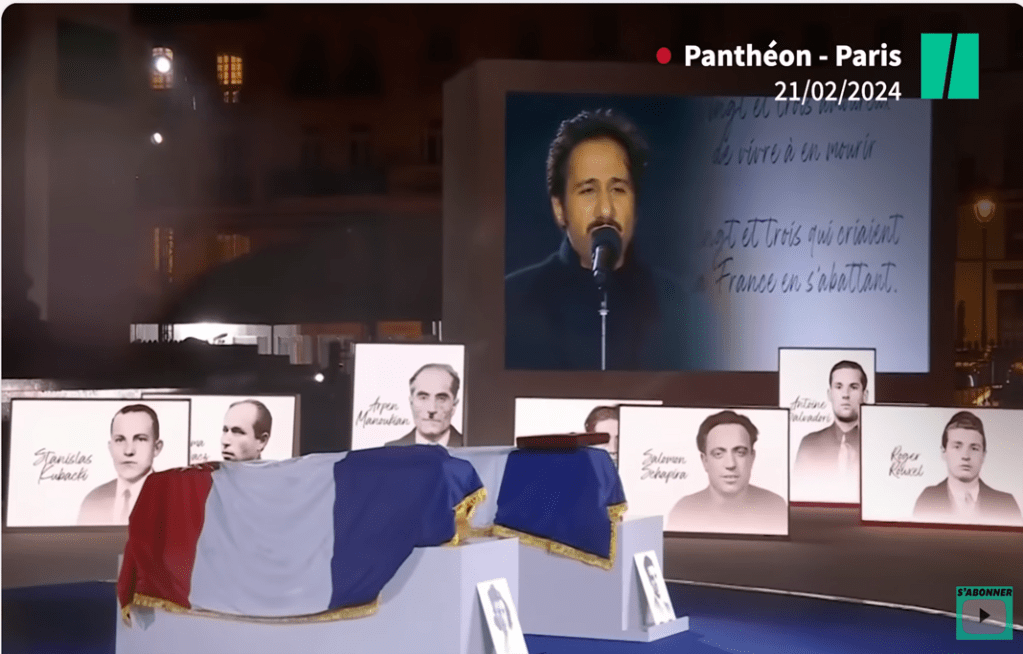 Voici l’affiche rouge, poème d’Aragon publié en 1955, mis en musique et chanté par Léo Ferré en 1961 et repris magnifiquement par Feu! Chatterton au cours de la cérémonie du 21 février 2024 au Panthéon.