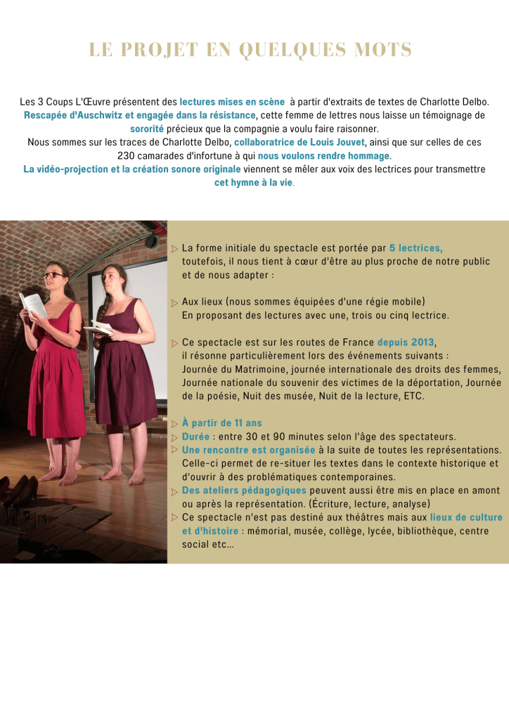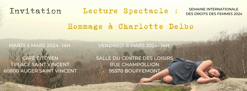 Enfin nous avons reçu une invitation de la Compagnie Les 3 coups L’œuvre pour leur spectacle sur Charlotte Delbo (Résistante, rescapée d’Auschwitz) qui aura lieu le mardi 5 mars à Auger-Saint-Vincent et le vendredi 8 mars à Bouffement