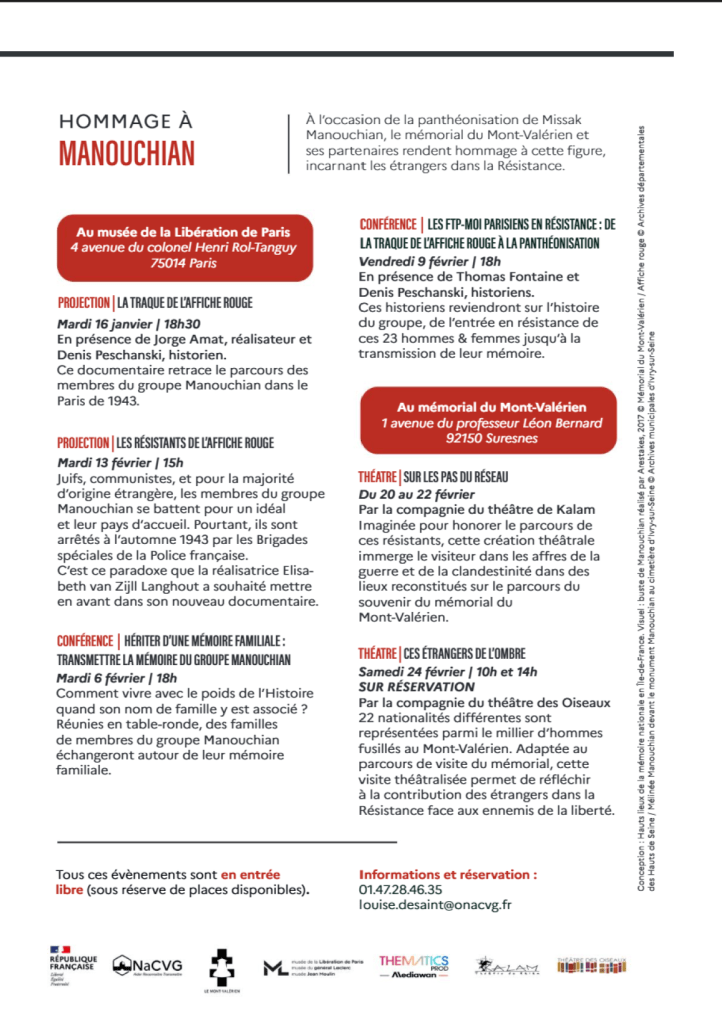 Le 21 février dernier, Missak Manouchian et avec lui sa femme Méminée et les « 23 de l’affiche rouge », tous étrangers, résistants et communistes rassemblés au sein des FTP-MOI. L’ANACR -Oise salue cette reconnaissance ; voici son message :