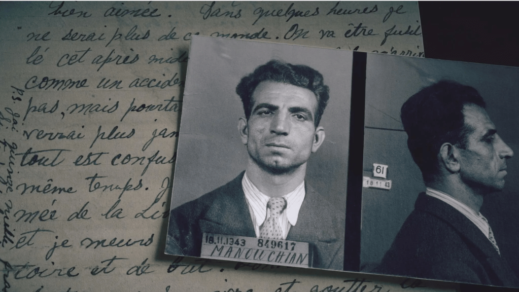 Le film s’ouvre avec l’interprétation de L’affiche rouge (poème d’Aragon, par Feu! Chatterton et se termine avec celle de Léo Ferré : « Strophes pour se souvenir » le poème d’Aragon mis en musique et interprété par Léo Ferré a fait de « ceux de l’affiche rouge » des héros connus de tous et le symbole de la France debout et fraternelle pour laquelle ces « Vingt et trois étrangers et nos frères pourtant » ont donné leur vie. Aragon et Ferré, deux poètes au service d’un autre poète. Et le groupe Feu! Chatterton leur fait suite avec beaucoup de talent et d’émotion.