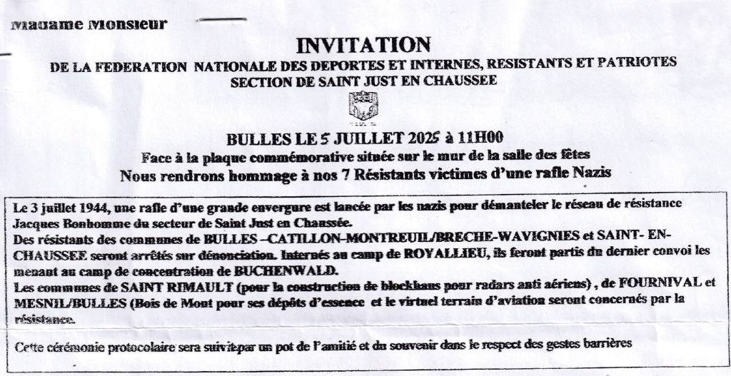 Commémoration à Bulles le 5 juillet et retour sur l’exposition de l’ANACR-Oise à Longueil Sainte-Marie