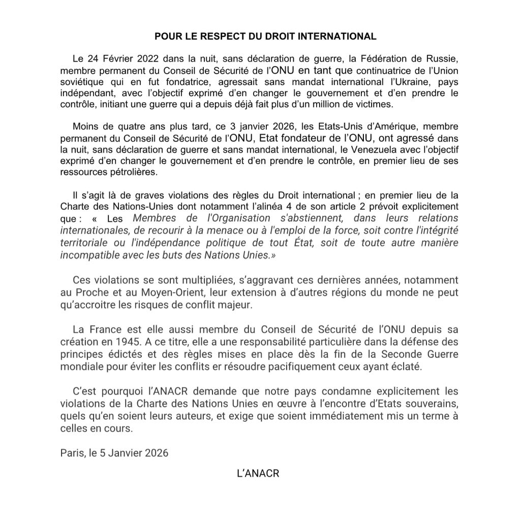 La déclaration de l’ANACR-National : après l’Ukraine en 2022, le Venezuela il y a deux jours… Et l’envahisseur, Russie ou USA, sont tous deux membres du Conseil de Sécurité de l’ONU !