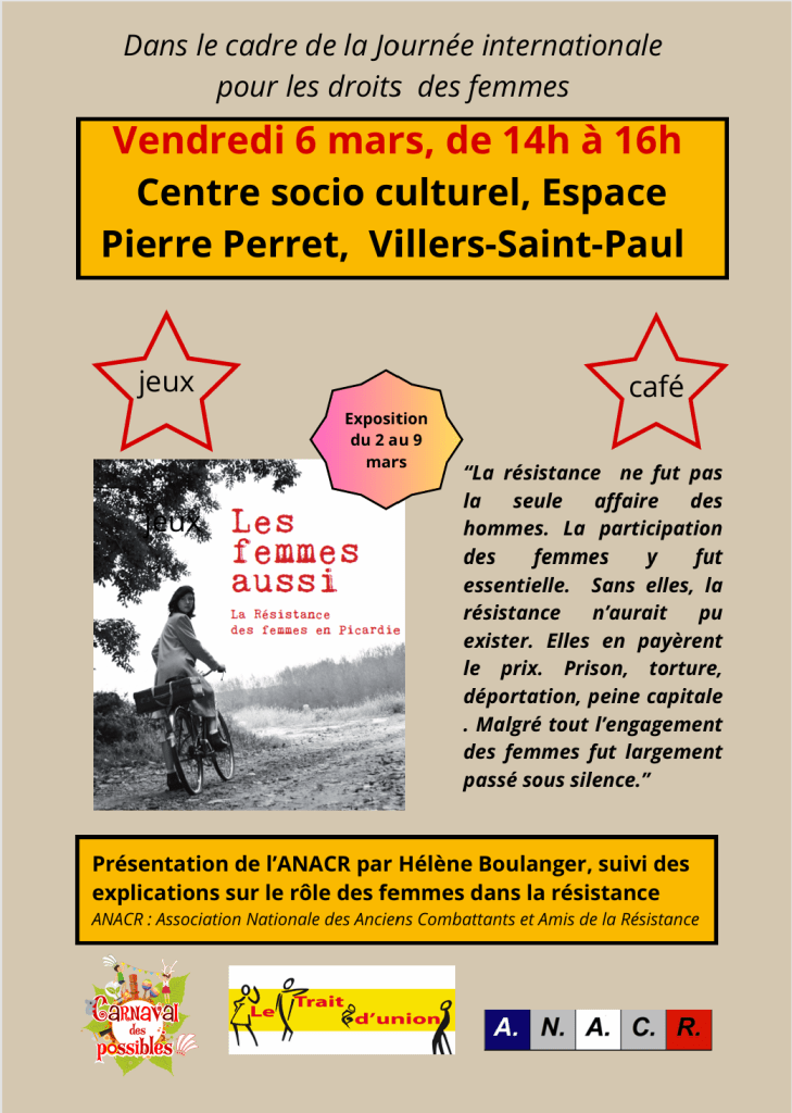 L’ANACR-Oise, pour sa première initiative de l’année 2026 sera présente à Villers-Saint-Paul du 2 au 9 mars 2026 avec son exposition Les femmes aussi, en partenariat avec l’association « Le Trait d’union » et le Carnaval des Possibles.